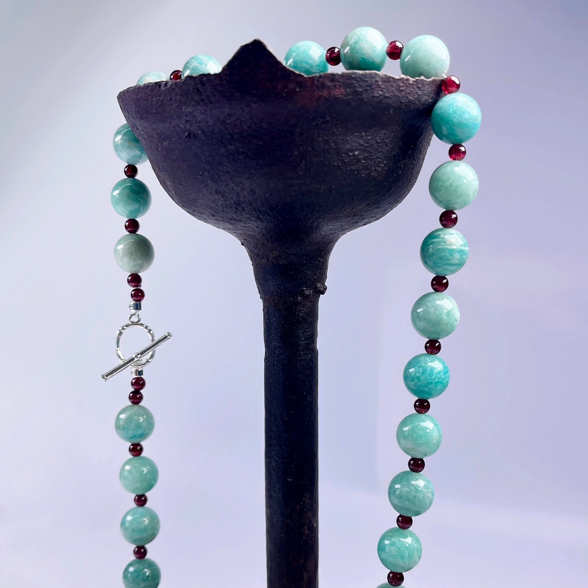 This stunning necklace features natural Amazonite beads, interspersed with smaller accent beads. Amazonite, a captivating gemstone, showcases beautiful shades of turquoise - green. However, please be aware that due to its natural origin, color variations are inherent. These irregularities are not flaws but rather a mark of the stone's authenticity, making each necklace unique.