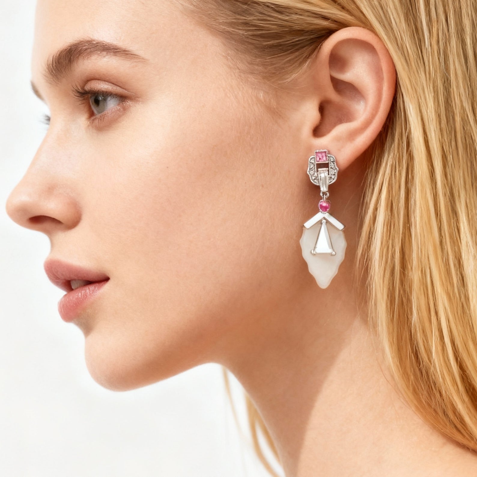 These art deco drop earrings feature a frosted agate pendant, paired with pink gem accents and sparkling details in silver settings. Blending vintage glamour with modern edge, they add bold, elegant charm to formal or statement looks.